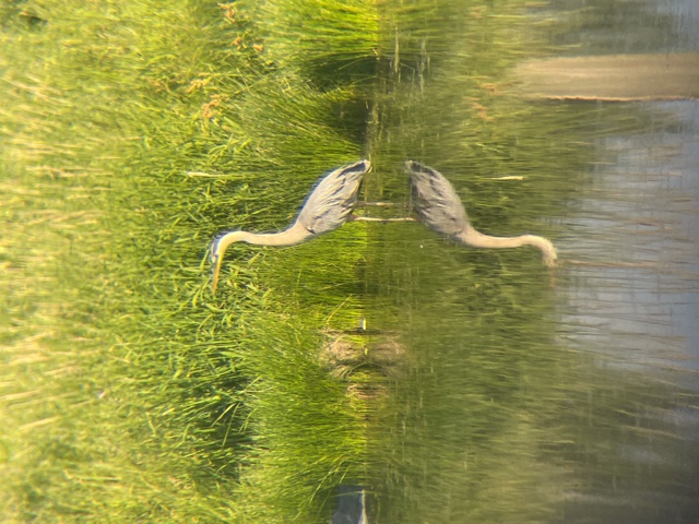 We saw a heron before we were out of the car. He was wading along the shoreline, hunting for frogs or fish or whatever. And now you watching along at home can see the heron, too, with the power of photography!!